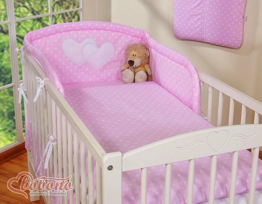 Hoog, licht afgerond hoofdbord met decoratieve harten, prachtig afgezet met satijnen bies. Speciaal afgezette, versterkte en verdikte bovenrand voor nog meer zachtheid en veiligheid in het ledikant.