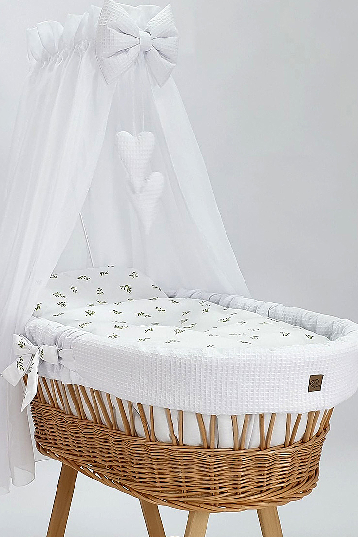 De binnenkant van de wieg is bekleed met zachte, ademende wafelkatoen in een elegante witt kleur. De dekenset is afgewerkt met een schattig takjesmotief- perfect voor een rustgevende en liefdevolle babykamer.