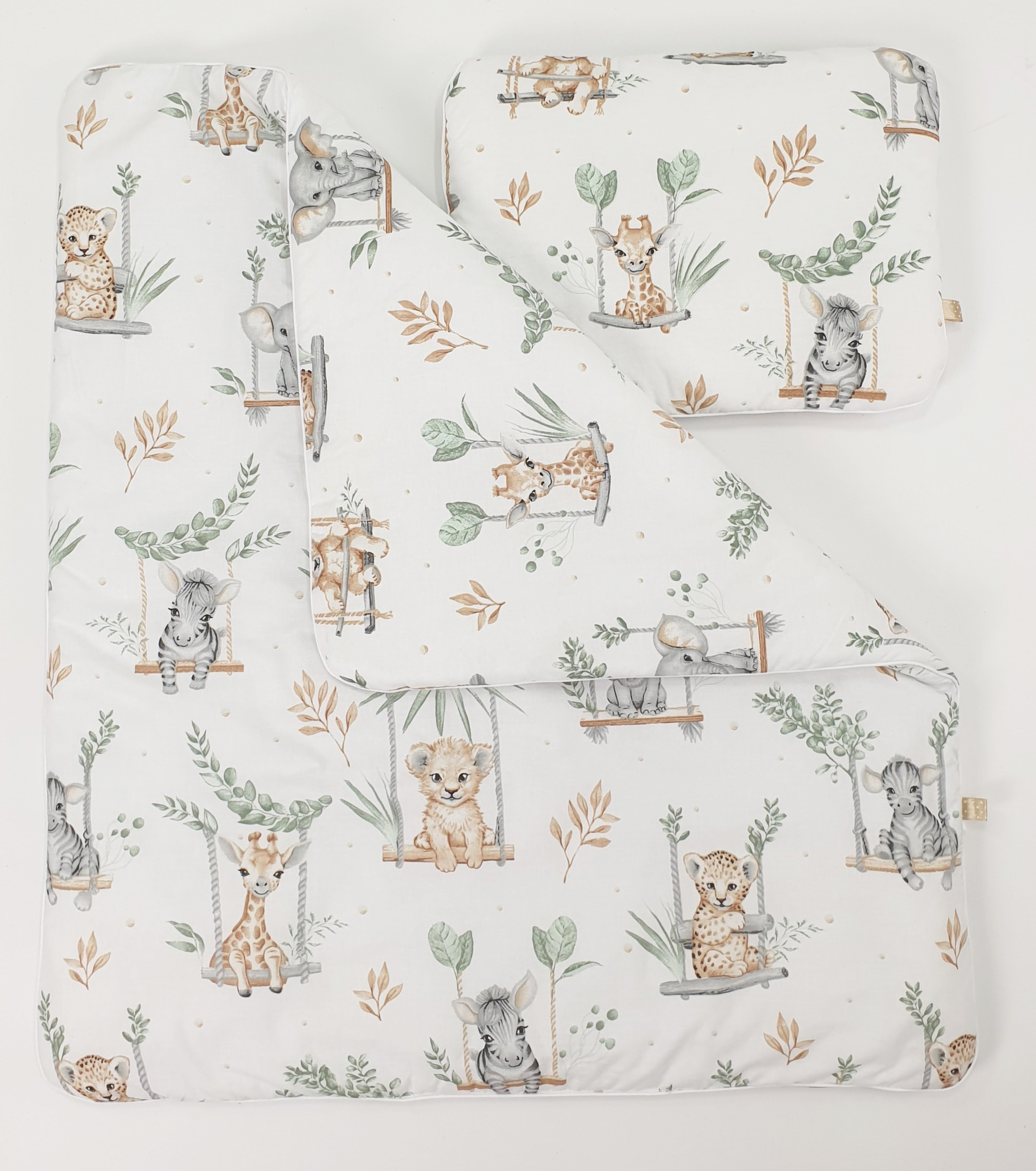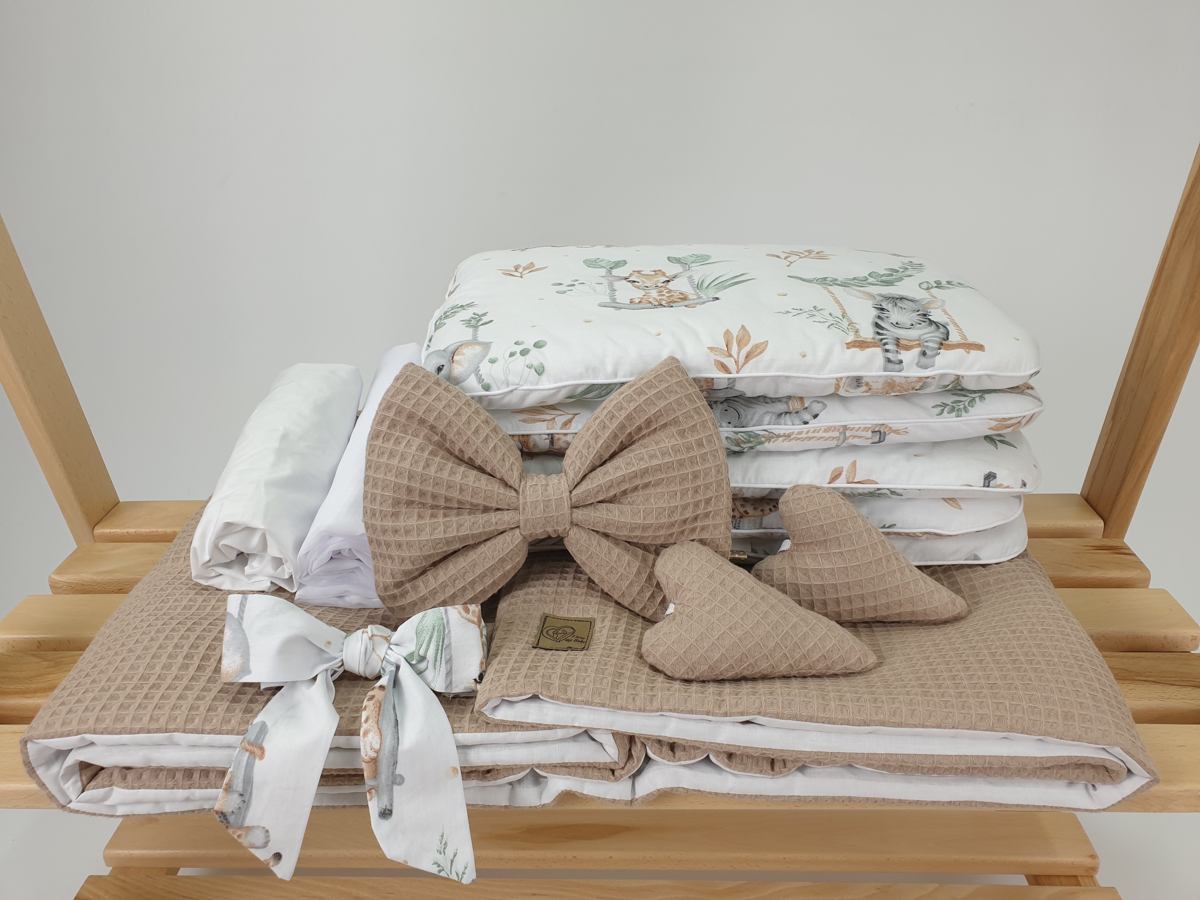 De binnenkant van de wieg is bekleed met zachte, ademende wafelkatoen in een elegante beige kleur. De dekenset is afgewerkt met een schattig safari motief - perfect voor een rustgevende en liefdevolle babykamer.