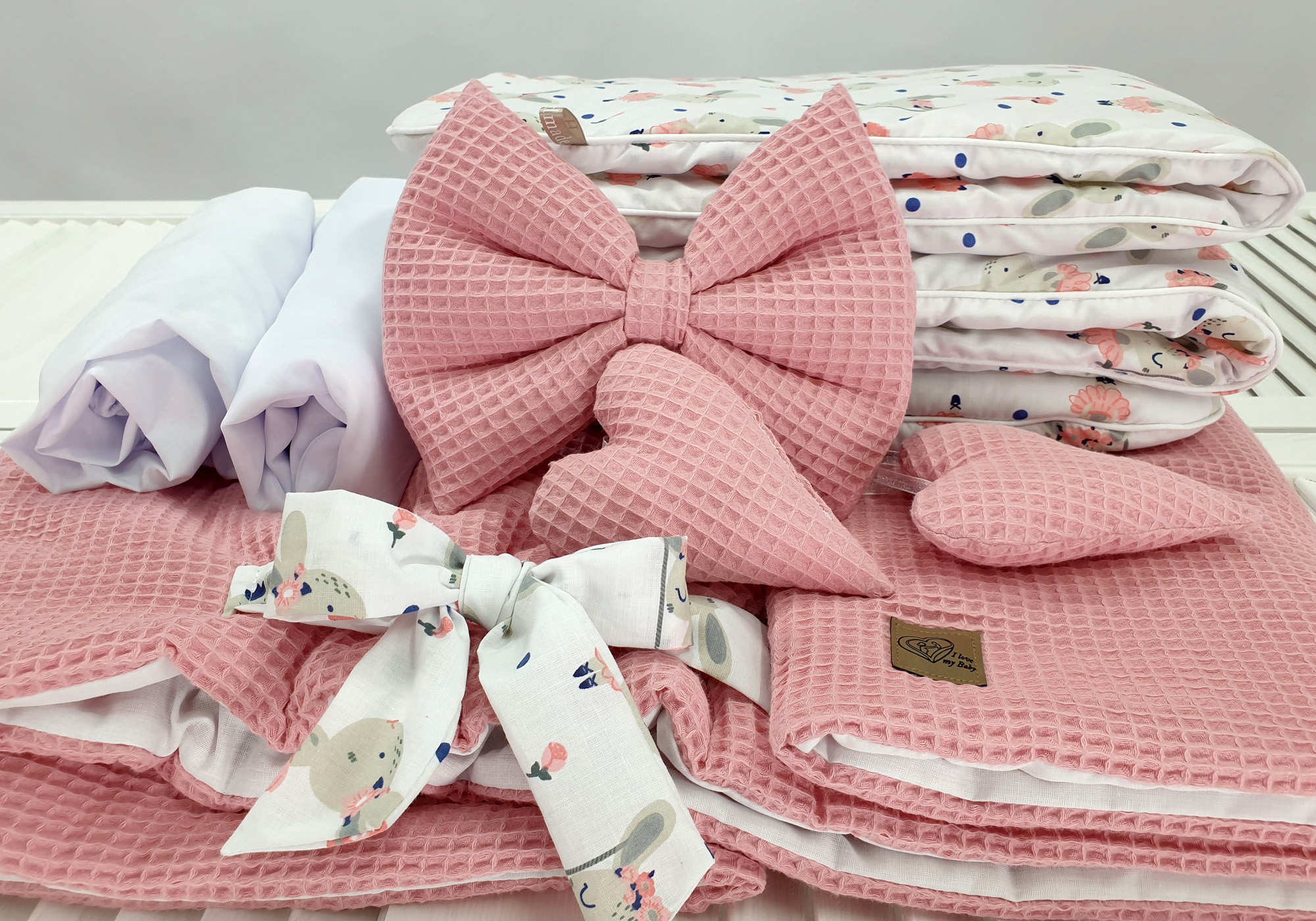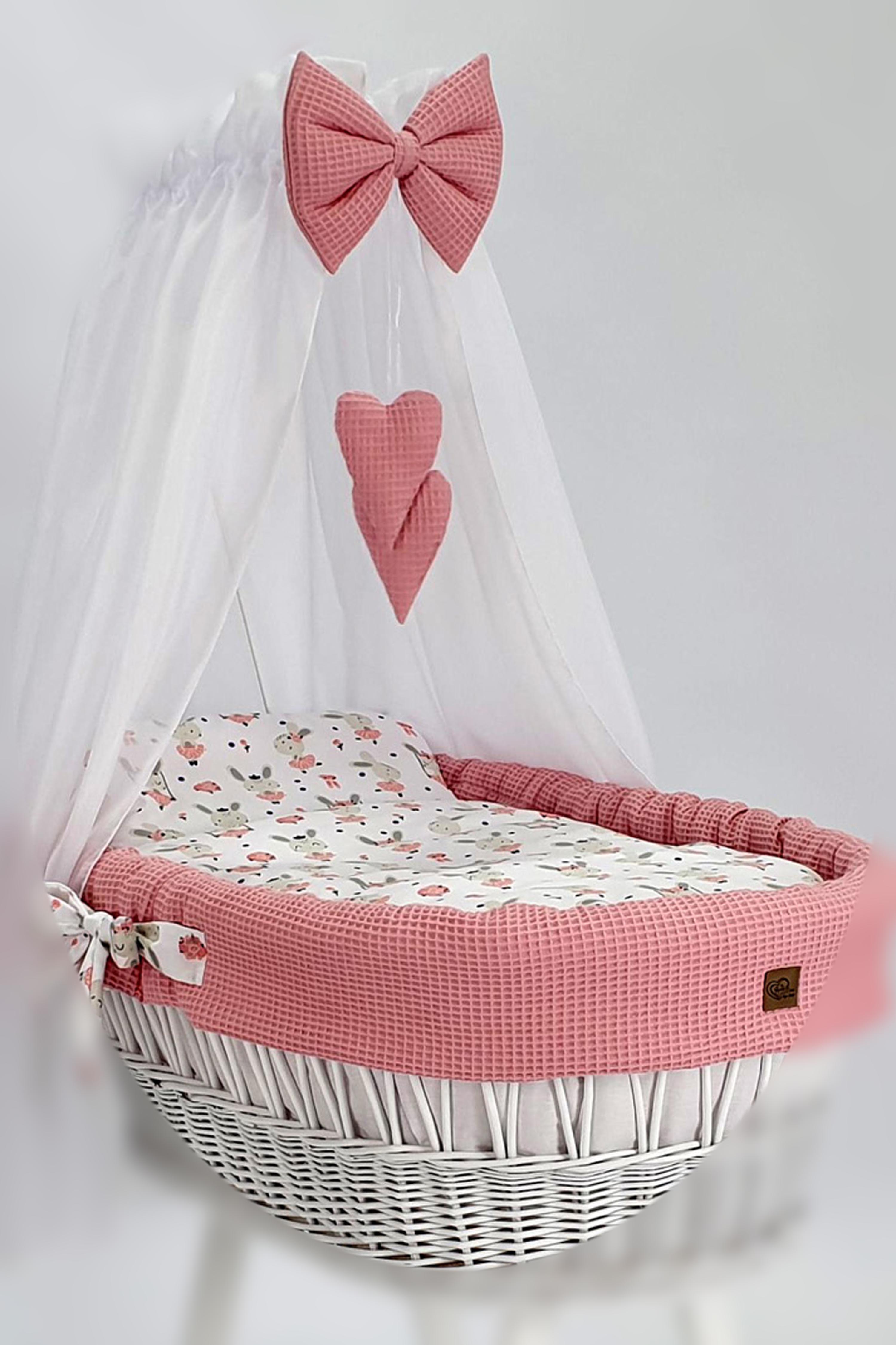 Deze wiegbekleding in poederroze wafelkatoen wordt gecombineerd met een lief konijntjesmotief op het dekentje en kussen. Ideaal voor een zachte, klassieke uitstraling in de babykamer.