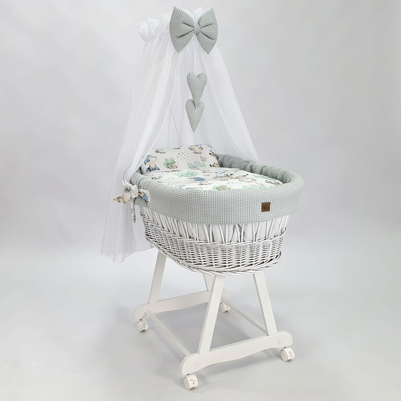 De binnenbekleding is gemaakt van hoogwaardige wafelkatoen in natuurlijke kleuren, gecombineerd met zorgvuldig gekozen motieven op het beddengoed. Extra praktisch: de wiegvoering heeft een opening voor het handvat van de mand, zodat je de wieg makkelijk kunt verplaatsen. (Let op: deze opening is niet zichtbaar op de productfoto’s.)