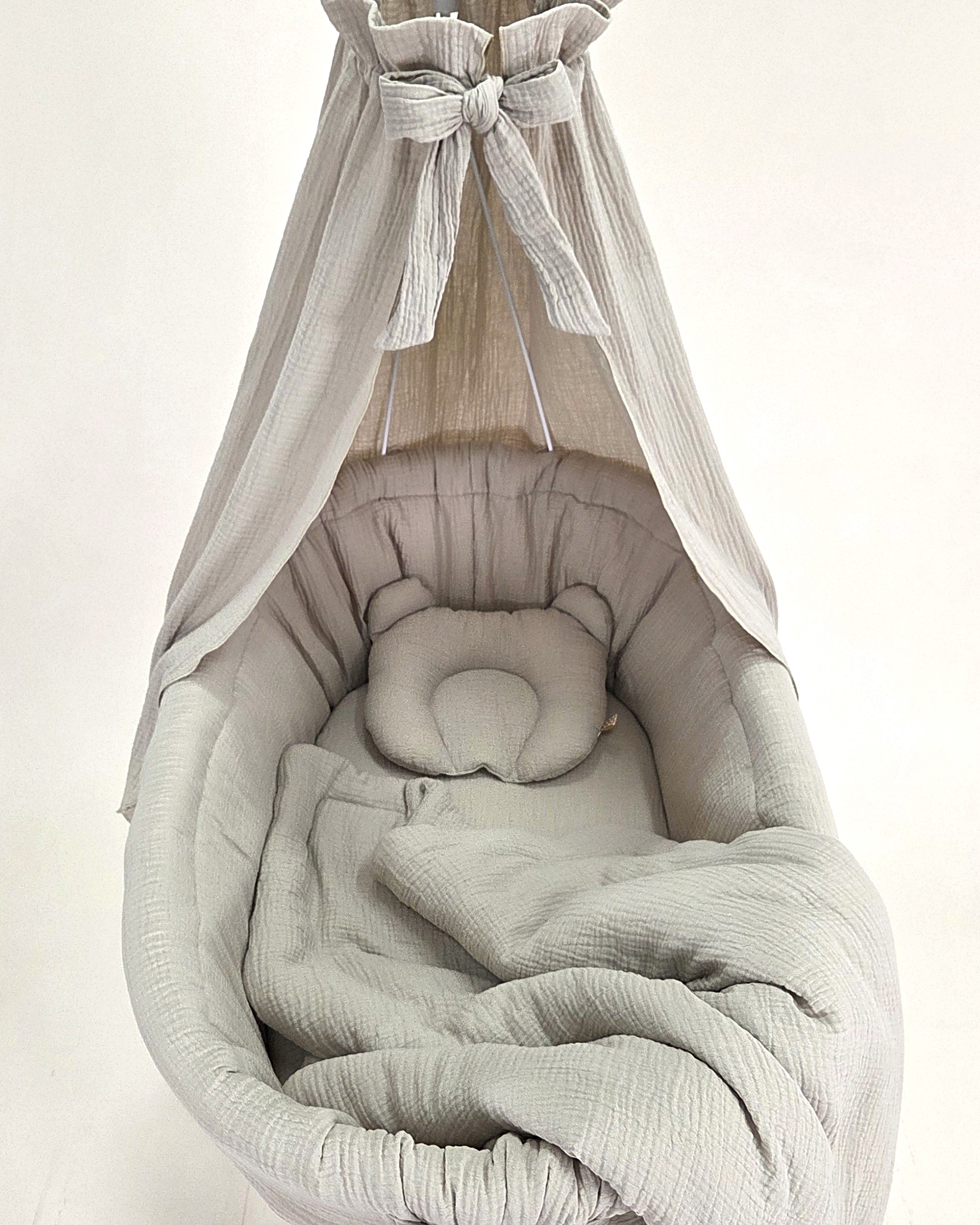 Geef je wieg een warme, natuurlijke uitstraling met dit complete mousseline wiegset in beige. Het set bevat alles wat je nodig hebt: wiegbekleding, hoeslaken, kussen in berenvorm, dekentje en een luchtige sluier.