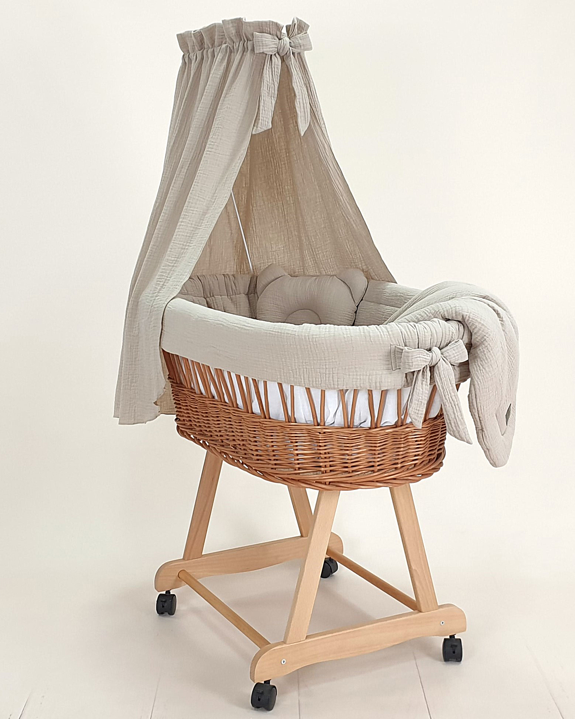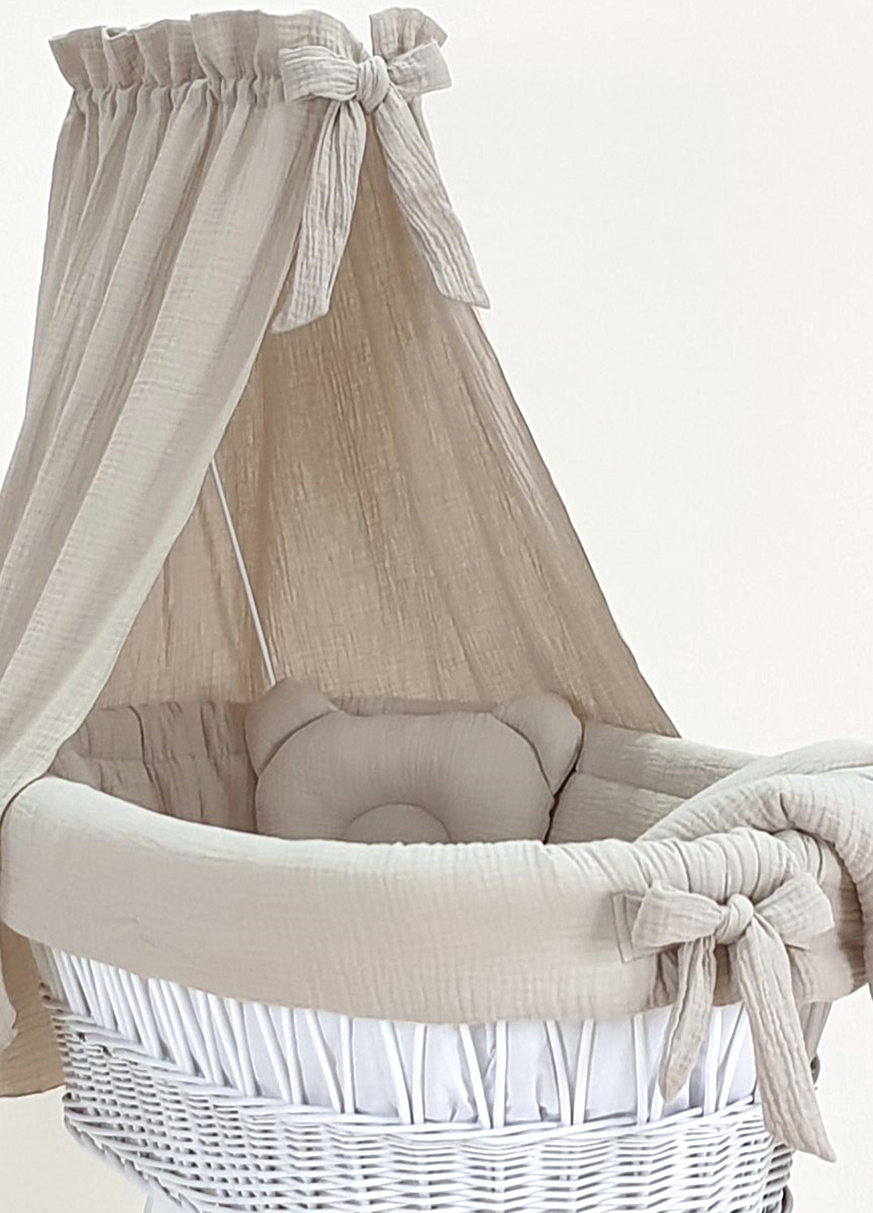 Dankzij de zachte mousseline stof (100% katoen, OEKO-TEX gecertificeerd) krijgt je baby een veilige en comfortabele slaapomgeving. Geschikt voor rieten wiegen van 55-60 × 90 × 30 cm.