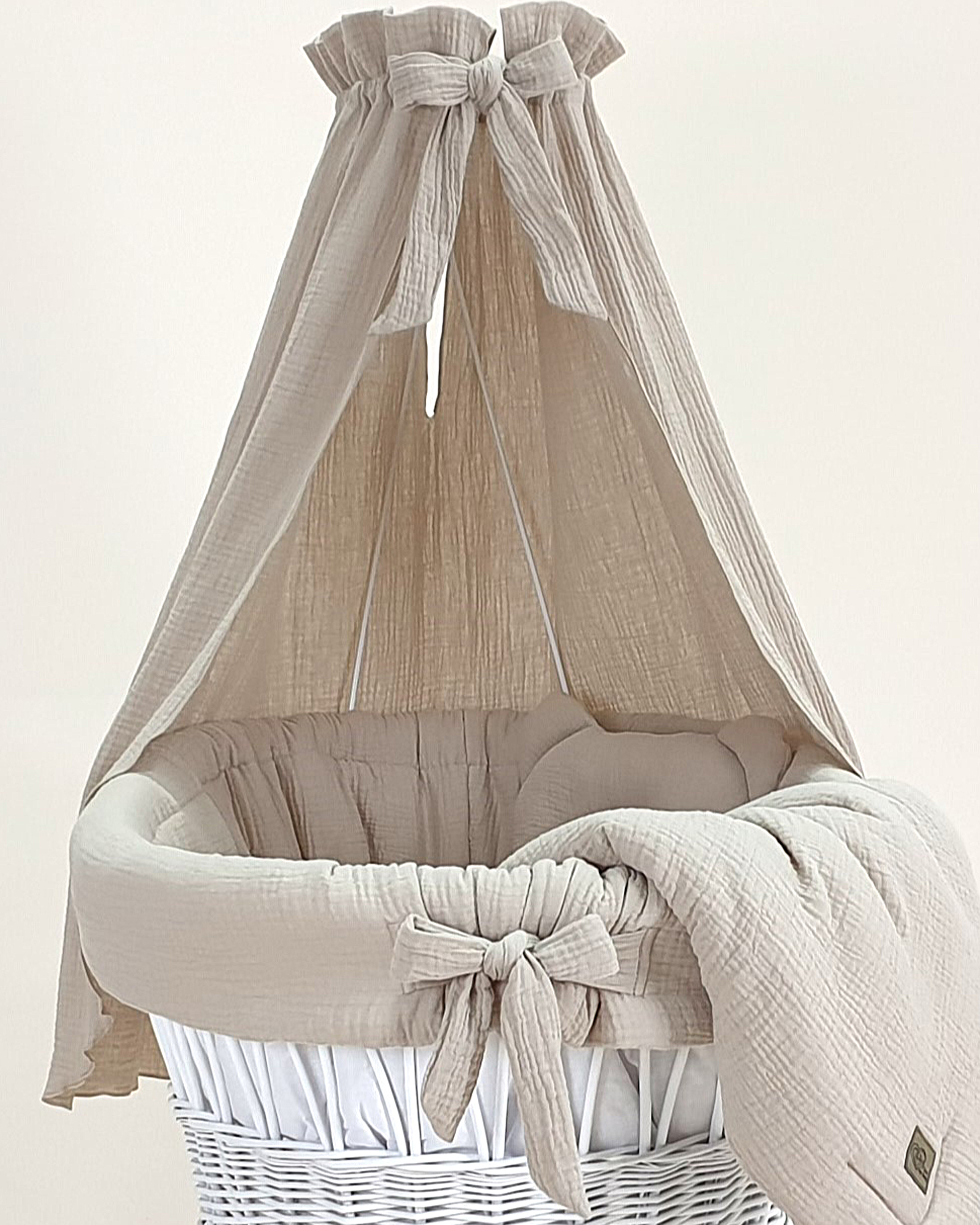 Geef je wieg een stijlvolle upgrade met dit complete textielset van zacht, ademend mousseline in de kleur beige. Dit hoogwaardige setje zorgt niet alleen voor een gezellige en veilige slaapomgeving voor je baby, maar voegt ook een natuurlijke en tijdloze uitstraling toe aan de babykamer.