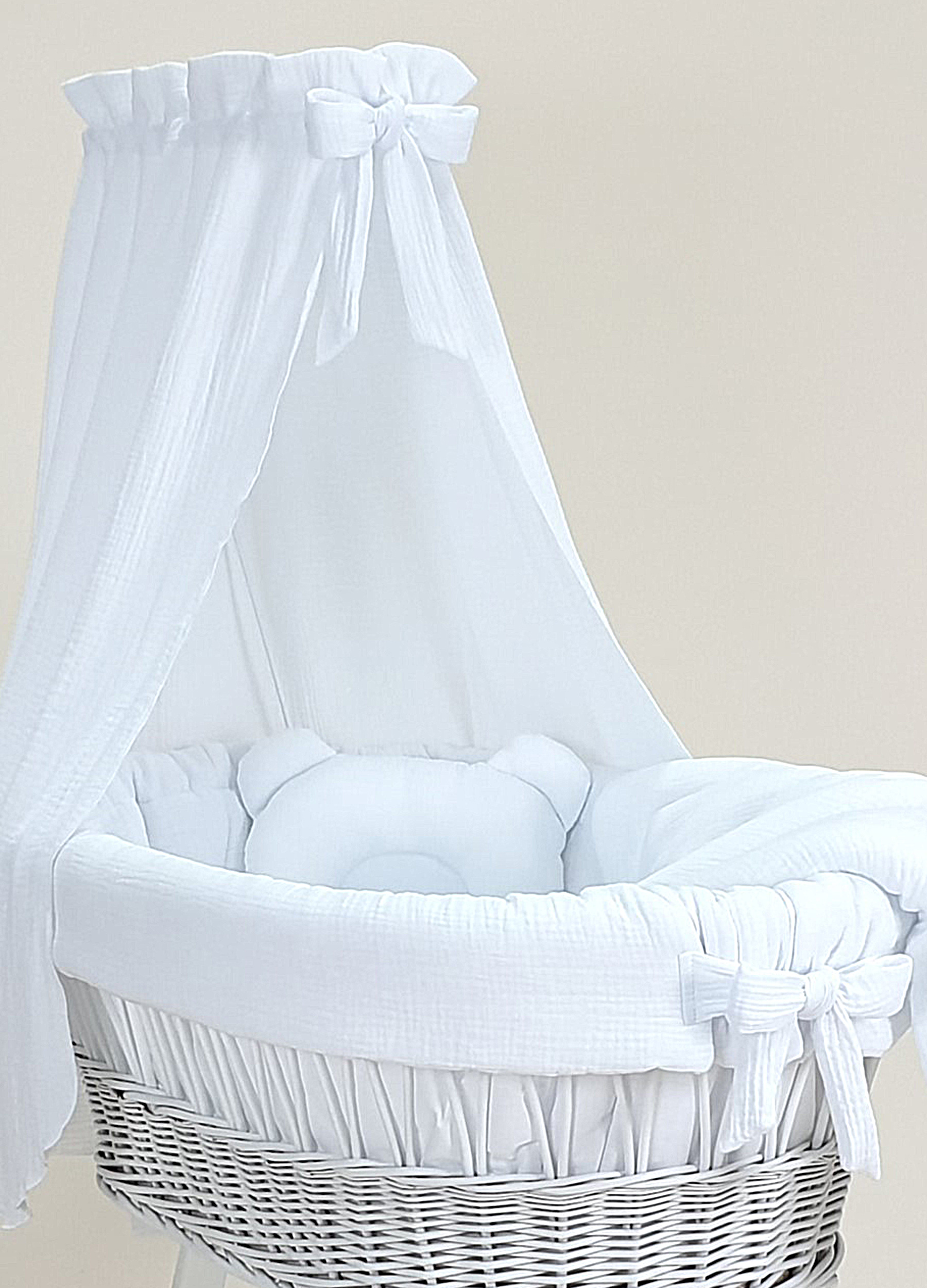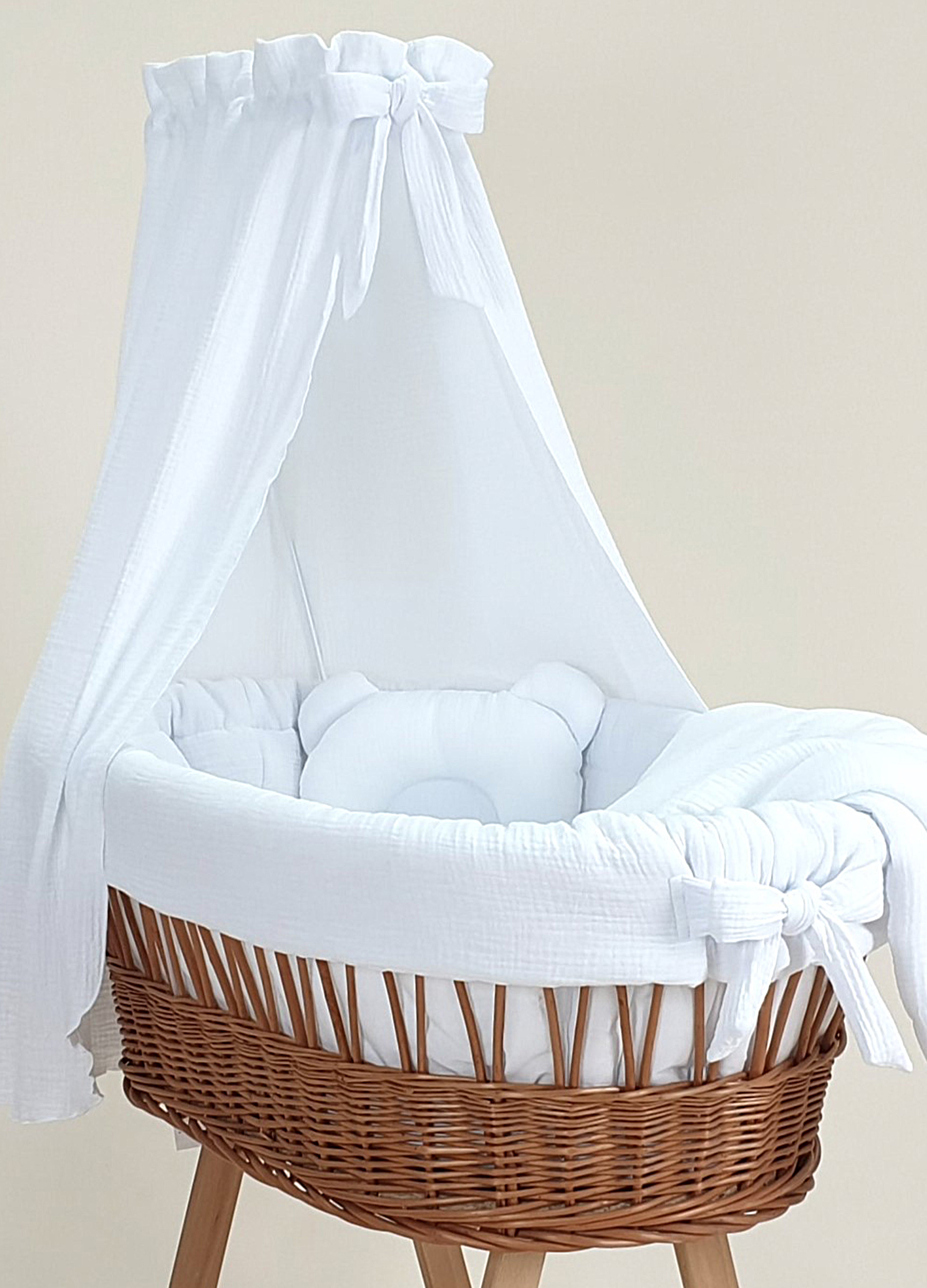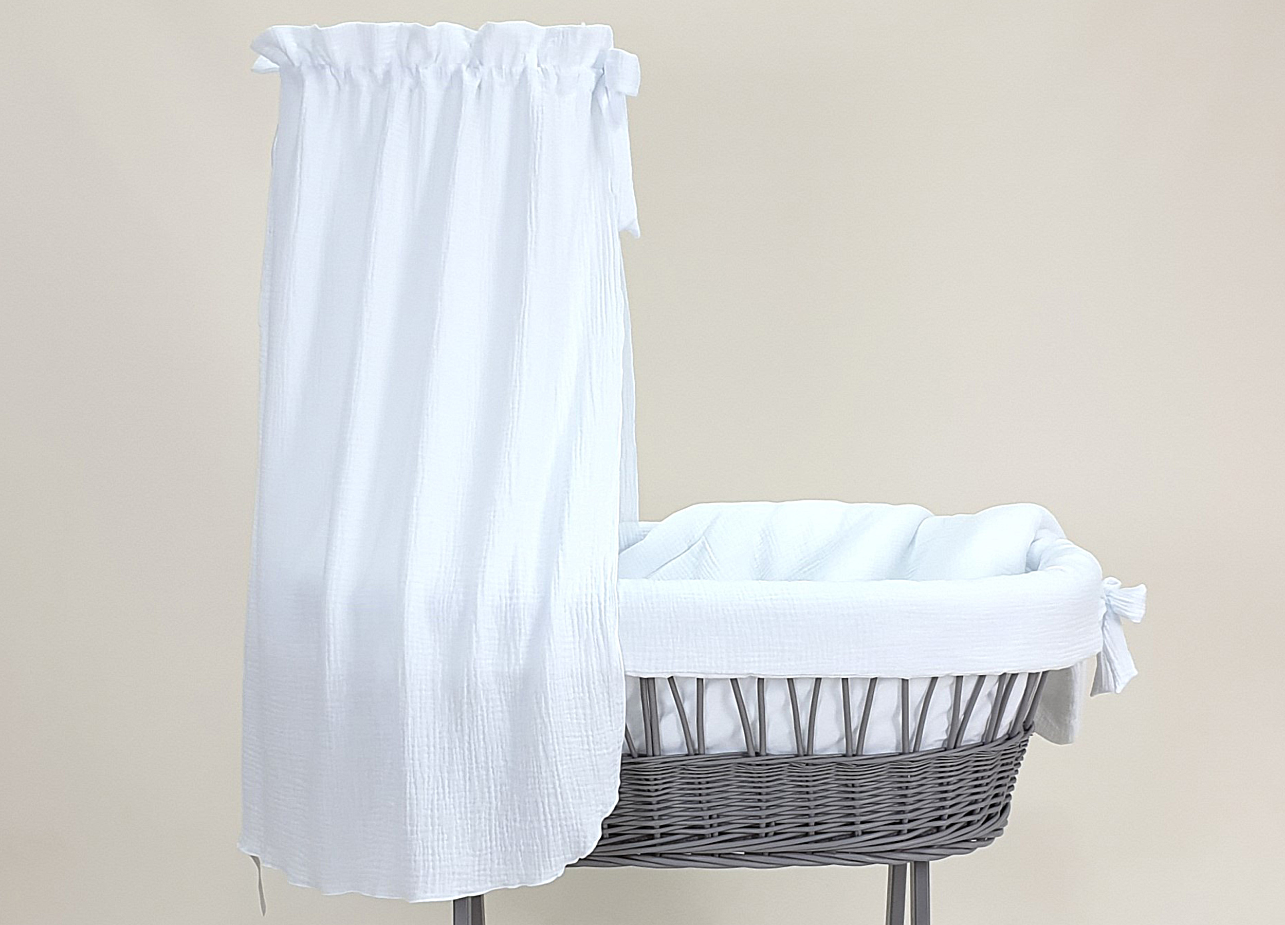 Gemaakt van ademend, huidvriendelijk katoen-mousseline en OEKO-TEX gecertificeerd. Past perfect in rieten wiegen van 55-60 × 90 × 30 cm.