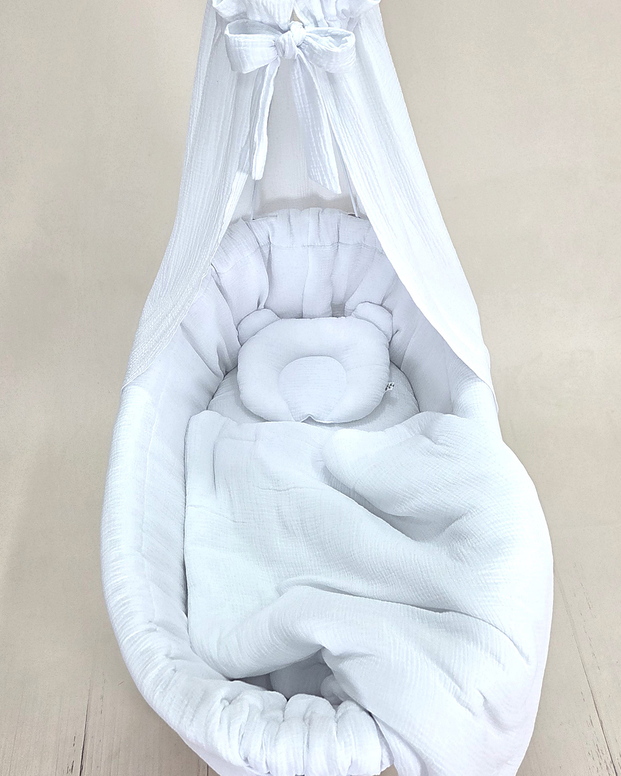 Kies voor pure eenvoud en frisheid met dit mousseline wiegset in wit. Het complete set bestaat uit wiegbekleding, een passend hoeslaken, een zacht dekentje, een kussen in berenvorm en een elegante hemel.