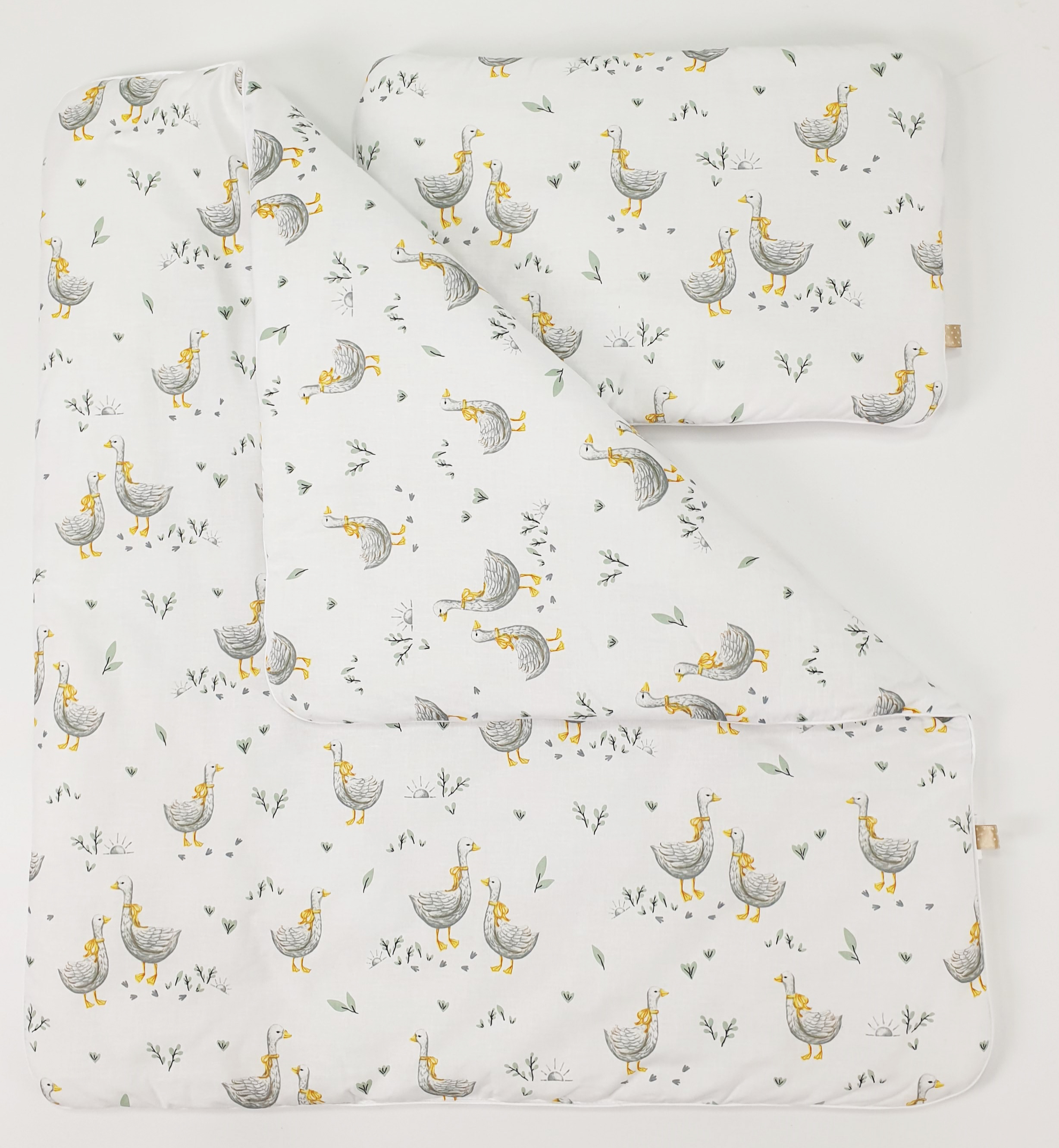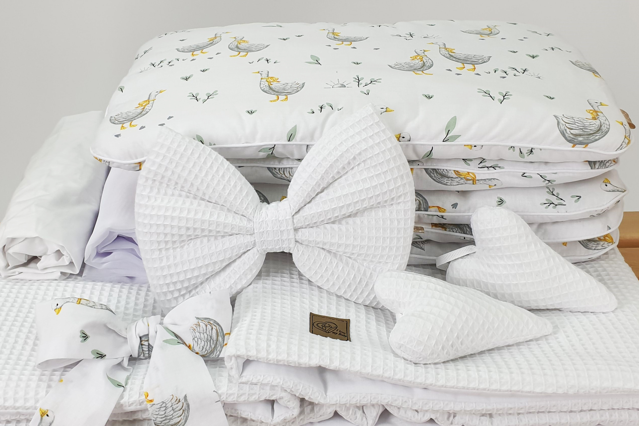 Kleur van het beddengoed: wit wafelstof met witte katoen en print van ganzen